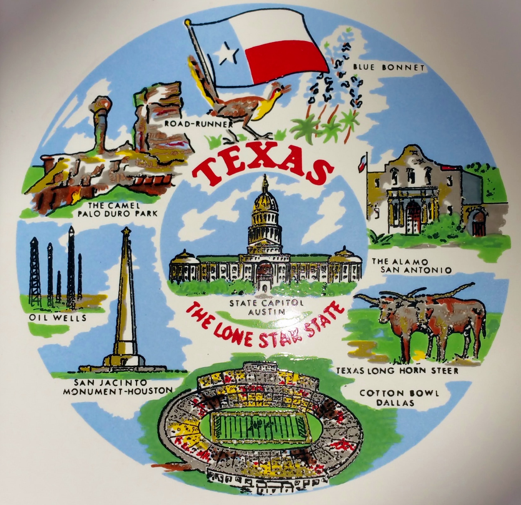 Yesterday morning at church I received a small gift from new friends. In an effort at clearing the clutter of their house Steve and Jim had a yard sale, but one thing Steve rescued and presented to me: a Texas trivet, the type of thing one finds in gift shops at every tourist attraction everywhere. It was Jim’s mother’s and tchotchke it may be, but I love it. It is Texas and new friends all rolled into one.